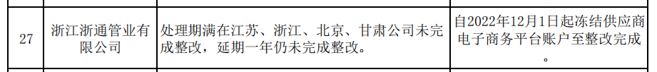 其中,浙江浙通管业有限公司因“处理期满在江苏、浙江、北京、甘肃公司未完成整改,延期一年仍未完成整改”被通报。处理措施:自2022年12月1日起冻结其在电子商务平台的账户至整改完成。
