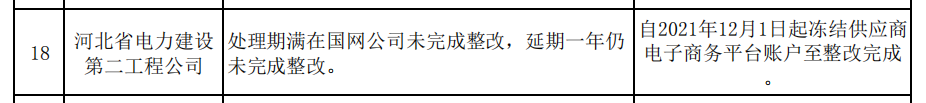 其中,河北省电力建设第二工程公司因“处理期满在国网公司未完成整改,延期一年仍未完成整改”被通报。处理措施:自2021年12月1日起冻结其在电子商务平台的账户至整改完成。