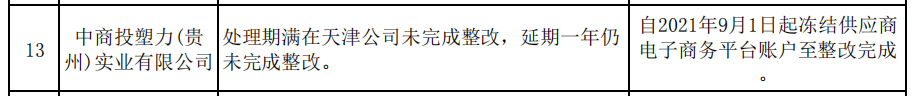 其中,中商投塑力(贵州)实业有限公司因“处理期满在天津公司未完成整改,延期一年仍未完成整改”被通报。处理措施:自2021年9月1日起冻结其在电子商务平台的账户至整改完成。