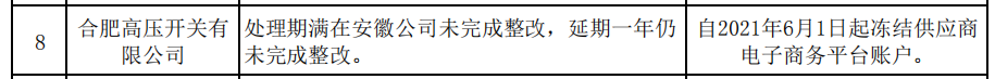其中,合肥高压开关有限公司因“处理期满在安徽公司未完成整改,延期一年仍未完成整改”被通报。处理措施:自2021年6月1日起冻结其在电子商务平台的账户。