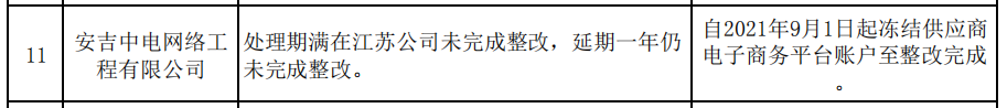 其中,安吉中电网络工程有限公司因“处理期满在江苏公司未完成整改,延期一年仍未完成整改”被通报。处理措施:自2021年9月1日起冻结其在电子商务平台的账户至整改完成。