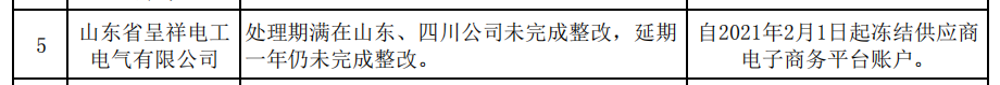 其中,山东呈祥电工电气有限公司因“处理期满在山东、四川公司未完成整改,延期一年仍未完成整改”被通报。处理措施:自2021年2月1日起对其在电子商务平台的账户进行冻结。