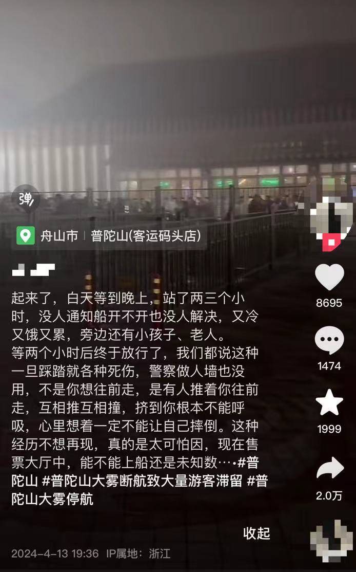 4月13日,浙江舟山,普陀山风景名胜区。网友发视频称因大雾停航,离岛游客大量滞留导致挤到不能呼吸。