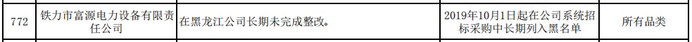 其中,铁力市富源电力设备有限责任公司在黑龙江公司长期未完成整改被通报。处理措施:2019年10月1日起在公司系统招标采购中长期列入黑名单。处理范围:所有品类。