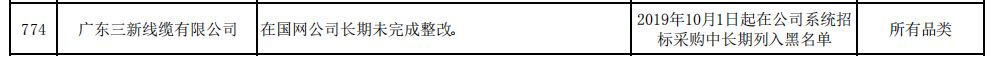 其中,广东三新线缆有限公司在国网公司长期未完成整改被通报。处理措施:2019年10月1日起在公司系统招标采购中长期列入黑名单。处理范围:所有品类。