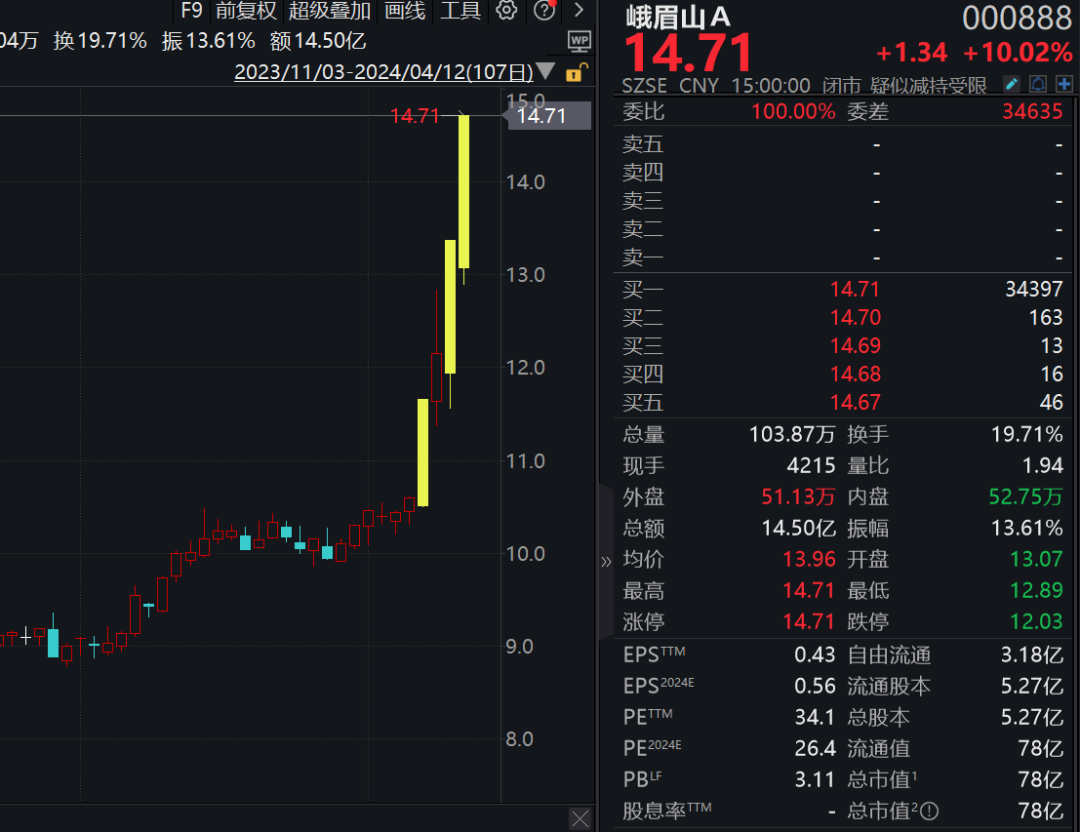 自4月9日以来,峨眉山A(000888)股性被激活,在最近4个交易日中,股价实现3次涨停,从10元/股左右涨至14元/股以上。