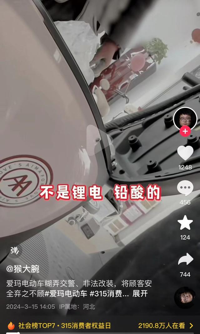 视频中,该博主在合肥市的爱玛电动车线下门店进行了实地探访,发现门店中的一些电动车合格证上写的锂电池,但是实际安装的却是铅酸电池。并且,店家称这是原厂家标配,这些不合规的电动车还可以正常在车管所上牌。