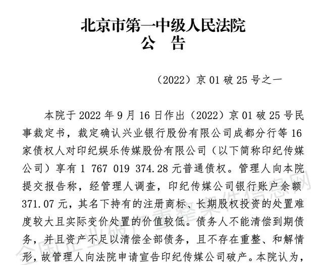 经过债权申报,2022年9月,北京市一中院认可兴业银行股份有限公司成都分行等16家债权人对印纪传媒公司享有17.67亿元普通债权。