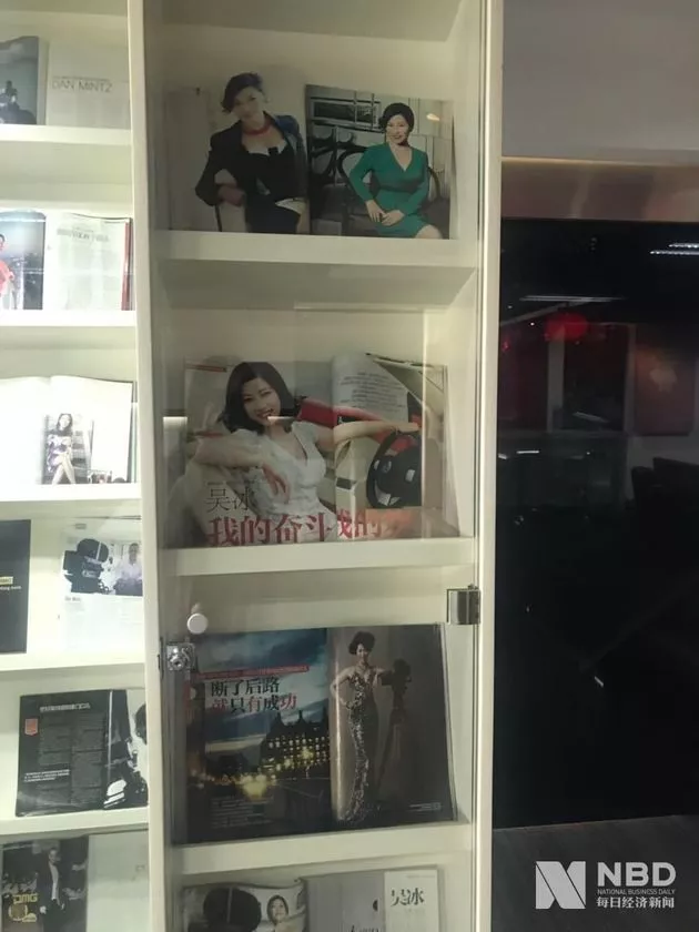2019年4月,展示柜摆放了董事长吴冰作为封面人物的各大杂志,图片来源:每经记者毕媛媛摄