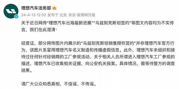 @理想汽车法务部 微博发文称,关于近日网传“理想汽车出海最新进展”“乌兹别克斯坦签约”等图文内容均为不实传言,我们在此澄清: