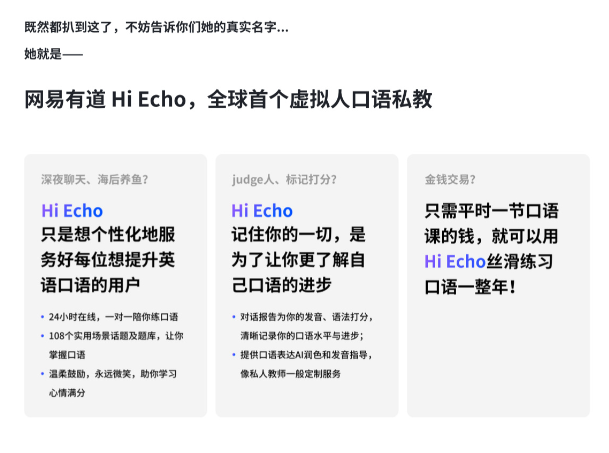 不过,该文件在末尾话锋一转,夸赞王爱可也拿过很多奖项,并在最后公布王爱可的真实姓名为“网易有道 Hi Echo”,是全球首个虚拟人口语私教。