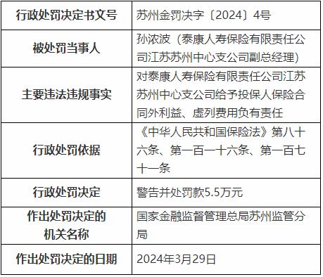 因对泰康人寿保险有限责任公司江苏苏州中心支公司给予投保人保险合同外利益、虚列费用负有责任,泰康人寿保险有限责任公司江苏苏州中心支公司副总经理孙浓波被警告并处罚款5.5万元。