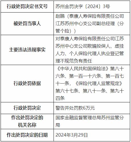 因对泰康人寿保险有限责任公司江苏苏州中心支公司欺骗投保人、虚挂人力、个人保险代理人执业登记管理不规范负有责任,泰康人寿保险有限责任公司江苏苏州中心支公司副总经理(分管个险)赵鹏,被警告并处罚款6万元。