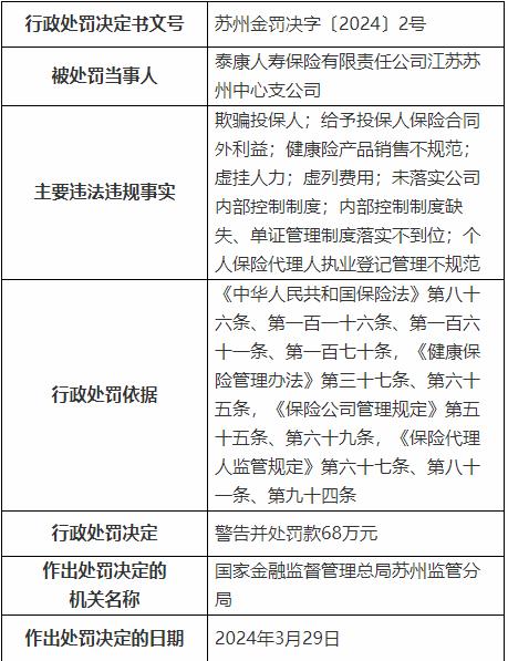 4月10日,国家金融监督管理总局苏州监管分局行政处罚信息显示,泰康人寿保险有限责任公司江苏苏州中心支公司被警告并处罚款68万元。主要违法违规事实有:欺骗投保人;给予投保人保险合同外利益;健康险产品销售不规范;虚挂人力;虚列费用;未落实公司内部控制制度;内部控制制度缺失、单证管理制度落实不到位;个人保险代理人执业登记管理不规范。