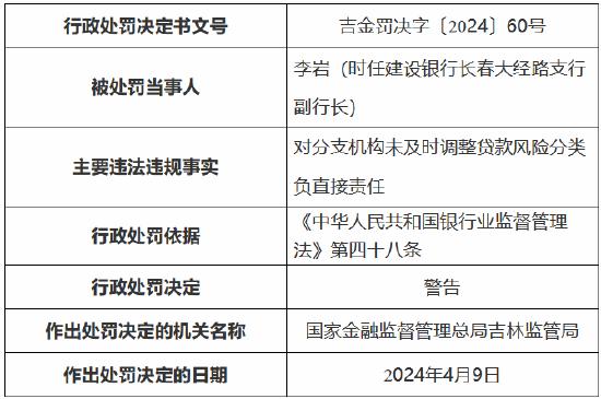 时任建设银行长春大经路支行副行长李岩,对分支机构未及时调整贷款风险分类负直接责任,受到警告。