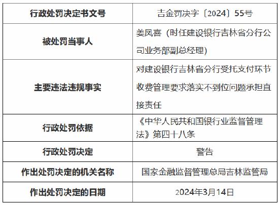 时任建设银行吉林省分行公司业务部副总经理姜凤喜,对公司受托支付环节收费管理要求落实不到位负直接责任,受到警告。