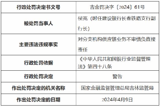 时任建设银行长春铁路支行副行长侯亮,对分支机构供应链业务不审慎负直接责任,受到警告。
