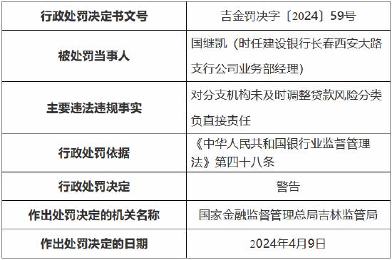 时任建设银行长春西安大路支行公司业务部经理国继凯,对分支机构未及时调整贷款风险分类负直接责任,受到警告。