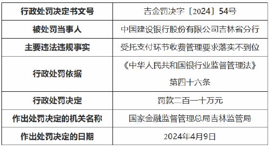 4月12日,国家金融监督管理总局吉林监管局行政处罚信息公开表显示,中国建设银行股份有限公司吉林省分行因受托支付环节收费管理要求落实不到位,被罚款210万元。