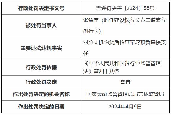 时任建设银行长春二道支行副行长张清宇,对分支机构贷后检查不尽职负直接责任,受到警告。