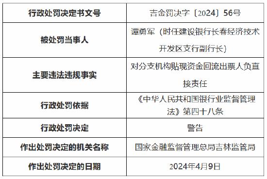 时任建设银行长春经济技术开发区支行副行长谭勇军,对分支机构贴现资金回流出票人负直接责任,受到警告。