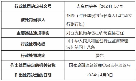 时任建设银行长春人民广场支行副行长赵峰,对分支机构存贷挂钩负直接责任,受到警告。