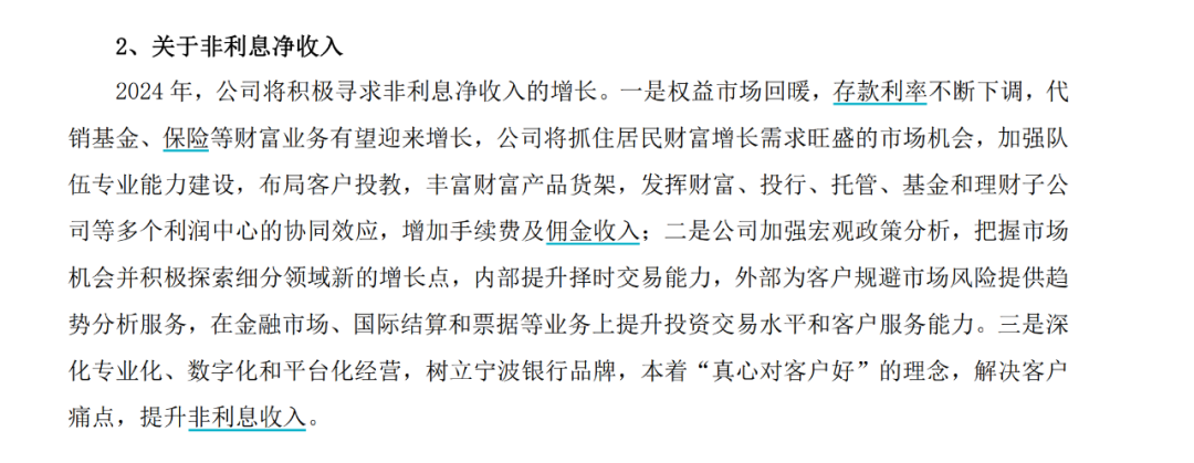 对此,宁波银行表示,2024年将积极寻求非利息净收入的增长。权益市场回暖,存款利率不断下调,代销基金、保险等财富业务有望迎来增长,公司将抓住居民财富增长需求旺盛的市场机会,加强队伍专业能力建设,布局客户投教,丰富财富产品货架,发挥财富、投行、托管、基金和理财子公司等多个利润中心的协同效应,增加手续费及佣金收入。