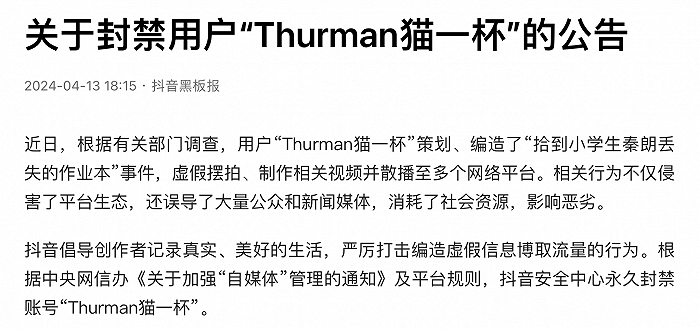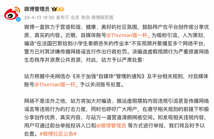 4月13日,@微博管理员 发文称,近期,自媒体账号@Thurman猫一杯_ 为吸粉引流,人为策划、编造“在法国巴黎拾到小学生秦朗丢失的作业本”不实视频并散播至多个网络平台,站方根据中央网信办《关于加强“自媒体”管理的通知》及平台相关规则,对自媒体账号@Thurman猫一杯_ 予以关闭账号处置。此前,微信平台已对视频账号“Thurman猫一杯”进行封号处置。抖音也发布公告称,永久封禁账号“Thurman猫一杯”。