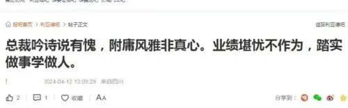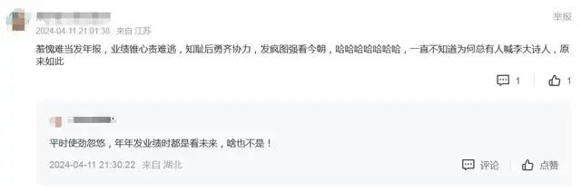 对于这份“反思式”的致辞,网友评论不一。有股民在股吧评论:“平时使劲忽悠,年年发业绩时都是看未来,啥也不是!”“哗众取宠 ”“总裁吟诗说有愧,附庸风雅非真心。业绩堪忧不作为,踏实做事学做人”;也有股民认为,“董事长致辞还是接地气的,有点才华,但是不多”“期待李老板诗集签名发布会”。