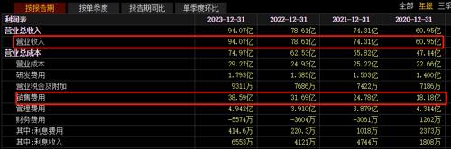 近四年(从2020年至2023年),公司的营业收入分别是60.95亿元、74.31亿元、78.61亿元、94.07亿元,持续增长且复合增速超过15%。同期,公司的销售费用分别为18.18亿元、24.78亿元、31.69亿元、38.59亿元,销售费用三年时间翻倍不止,复合增速接近30%,远超营收增速。