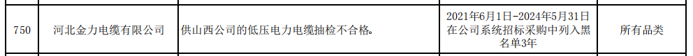 其中,河北金力电缆有限公司供山西公司的低压电力电缆抽检不合格被通报。处理措施:2021年6月1日-2024年5月31日在公司系统招标采购中列入黑名单3年。处理范围:所有品类。