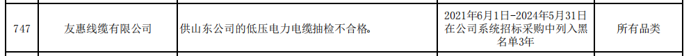 其中,友惠线缆有限公司供山东公司的低压电力电缆抽检不合格被通报。处理措施:2021年6月1日-2024年5月31日在公司系统招标采购中列入黑名单3年。处理范围:所有品类。