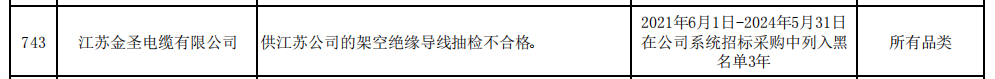 其中,江苏金圣电缆有限公司供江苏公司的架空绝缘导线抽检不合格被通报。处理措施:2021年6月1日-2024年5月31日在公司系统招标采购中列入黑名单3年。处理范围:所有品类。