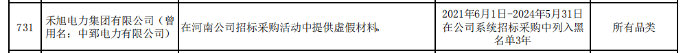 其中,禾旭电力集团有限公司(曾用名:中到电力有限公司)在河南公司招标采购活动中提供虚假材料被通报。处理措施:2021年6月1日-2024年5月31日在公司系统招标采购中列入黑名单3年。处理范围:所有品类。