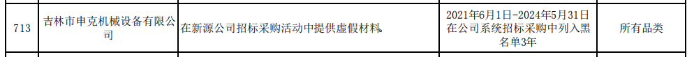 其中,吉林市申克机械设备有限公司在新源公司招标采购活动中提供虚假材料被通报。处理措施:2021年6月1日-2024年5月31日在公司系统招标采购中列入黑名单3年。处理范围:所有品类。
