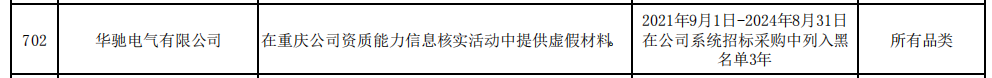 其中,华驰电气有限公司在重庆公司资质能力信息核实活动中提供虚假材料被通报。处理措施:2021年9月1日-2024年8月31日在公司系统招标采购中列入黑名单3年。处理范围:所有品类。