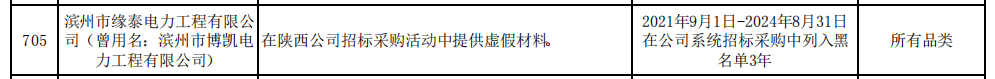 其中,滨州市缘泰电力工程有限公司(曾用名:滨州市博凯电力工程有限公司)在陕西公司招标采购活动中提供虚假材料被通报。处理措施:2021年9月1日-2024年8月31日在公司系统招标采购中列入黑名单3年。处理范围:所有品类。