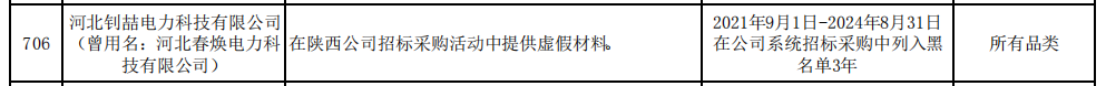 其中,河北钊喆电力科技有限公司(曾用名:河北春焕电力科技有限公司)在陕西公司招标采购活动中提供虚假材料被通报。处理措施:2021年9月1日-2024年8月31日在公司系统招标采购中列入黑名单3年。处理范围:所有品类。
