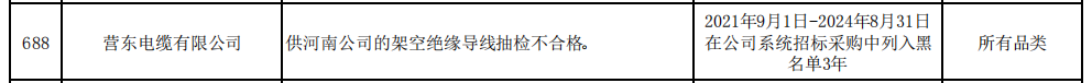 其中,营东电缆有限公司因供河南公司的架空绝缘导线抽检不合格被通报。处理措施:2021年9月1日-2024年8月31日在公司系统招标采购中列入黑名单3年。处理范围:所有品类。