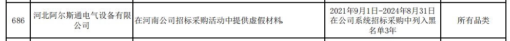 其中,河北阿尔斯通电气设备有限公司因在河南公司招标采购活动中提供虚假材料被通报。处理措施:2021年9月1日-2024年8月31日在公司系统招标采购中列入黑名单3年。处理范围:所有品类。