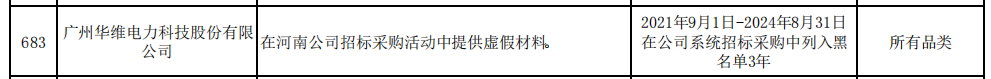 其中,广州华维电力科技股份有限公司因在河南公司招标采购活动中提供虚假材料被通报。处理措施:2021年9月1日-2024年8月31日在公司系统招标采购中列入黑名单3年。处理范围:所有品类。