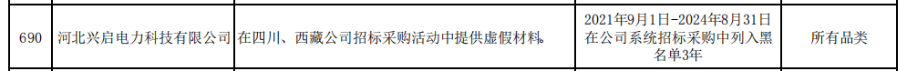 其中,河北兴启电力科技有限公司因在四川、西藏公司招标采购活动中提供虚假材料被通报。处理措施:2021年9月1日-2024年8月31日在公司系统招标采购中列入黑名单3年。处理范围:所有品类。