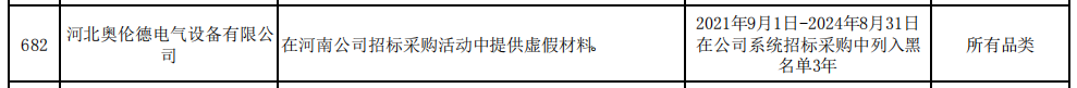 其中,河北奥伦德电气设备有限公司因在河南公司招标采购活动中提供虚假材料被通报。处理措施:2021年9月1日-2024年8月31日在公司系统招标采购中列入黑名单3年。处理范围:所有品类。