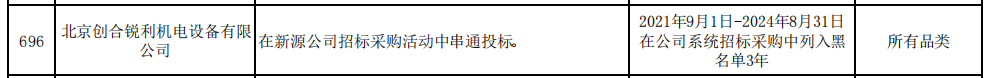 其中,北京创合锐利机电设备有限公司因在新源公司招标采购活动中串通投标被通报。处理措施:2021年9月1日-2024年8月31日在公司系统招标采购中列入黑名单3年。处理范围:所有品类。