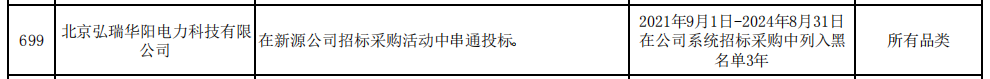 其中,北京弘瑞华阳电力科技有限公司因在新源公司招标采购活动中串通投标被通报。处理措施:2021年9月1日-2024年8月31日在公司系统招标采购中列入黑名单3年。处理范围:所有品类。