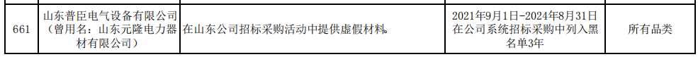 其中,山东普臣电气设备有限公司(曾用名:山东元隆电力器材有限公司)在山东公司招标采购活动中提供虚假材料被通报。处理措施:2021年9月1日-2024年8月31日在公司系统招标采购中列入黑名单3年。处理范围:所有品类。