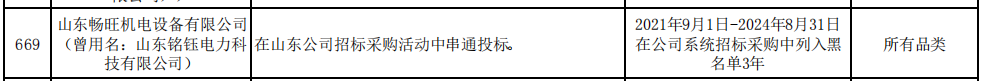 其中,山东畅旺机电设备有限公司(曾用名:山东铭钰电力科技有限公司)在山东公司招标采购活动中串通投标被通报。处理措施:2021年9月1日-2024年8月31日在公司系统招标采购中列入黑名单3年。处理范围:所有品类。