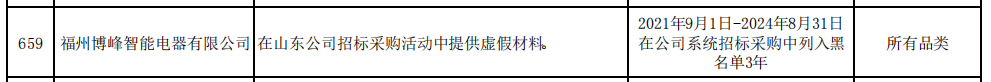 其中,福州博峰智能电器有限公司在山东公司招标采购活动中提供虚假材料被通报。处理措施:2021年9月1日-2024年8月31日在公司系统招标采购中列入黑名单3年。处理范围:所有品类。