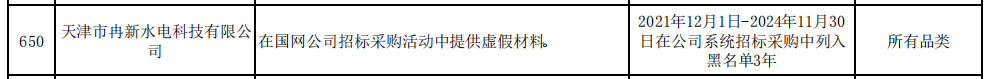 其中,天津市冉新水电科技有限公司在国网公司招标采购活动中提供虚假材料被通报。处理措施:2021年12月1日-2024年11月30日在公司系统招标采购中列入黑名单3年。处理范围:所有品类。