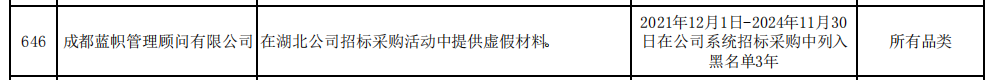 其中,成都蓝帜管理顾问有限公司在湖北公司招标采购活动中提供虚假材料被通报。处理措施:2021年12月1日-2024年11月30日在公司系统招标采购中列入黑名单3年。处理范围:所有品类。